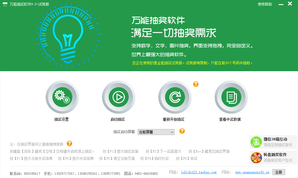 万能抽奖软件使用教程视频网址:http://cloud.video.taobao.com//play/u/15587494/p/1/e/6/t/1/50041084498.mp4